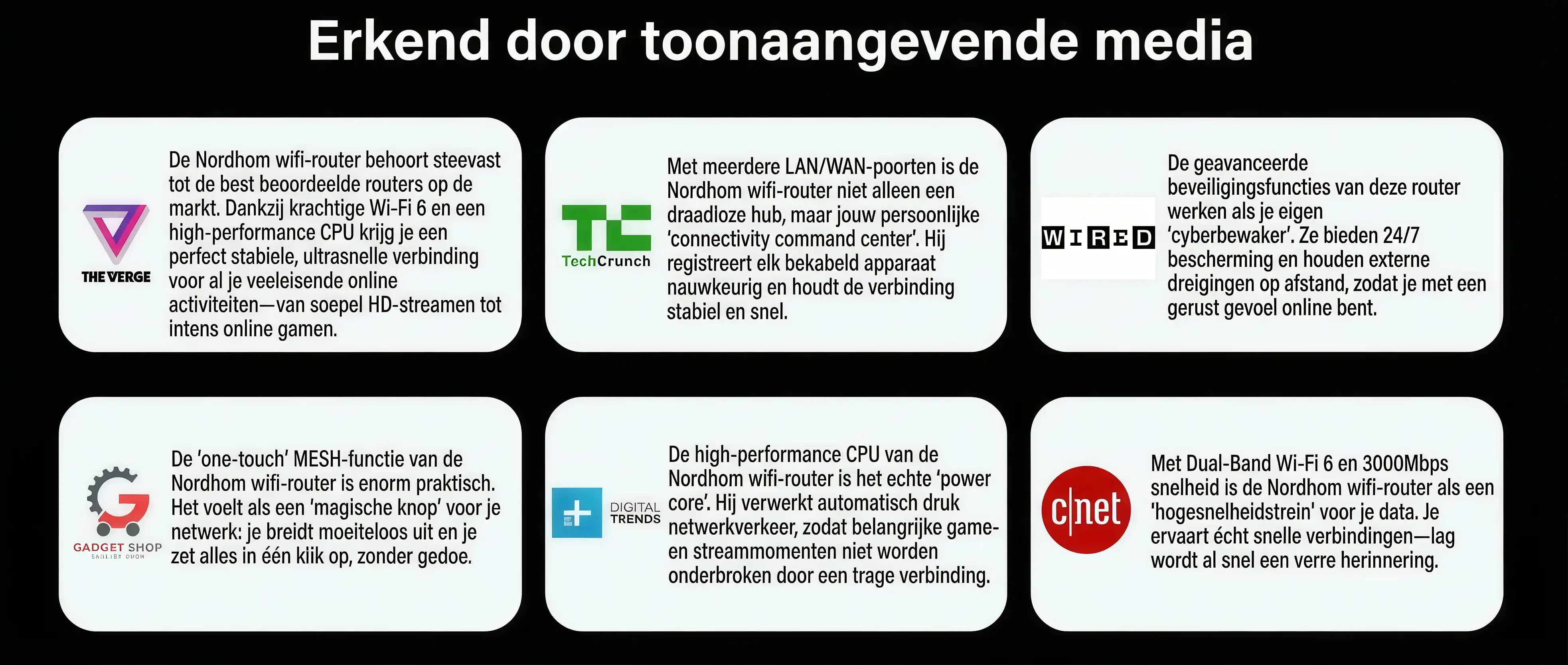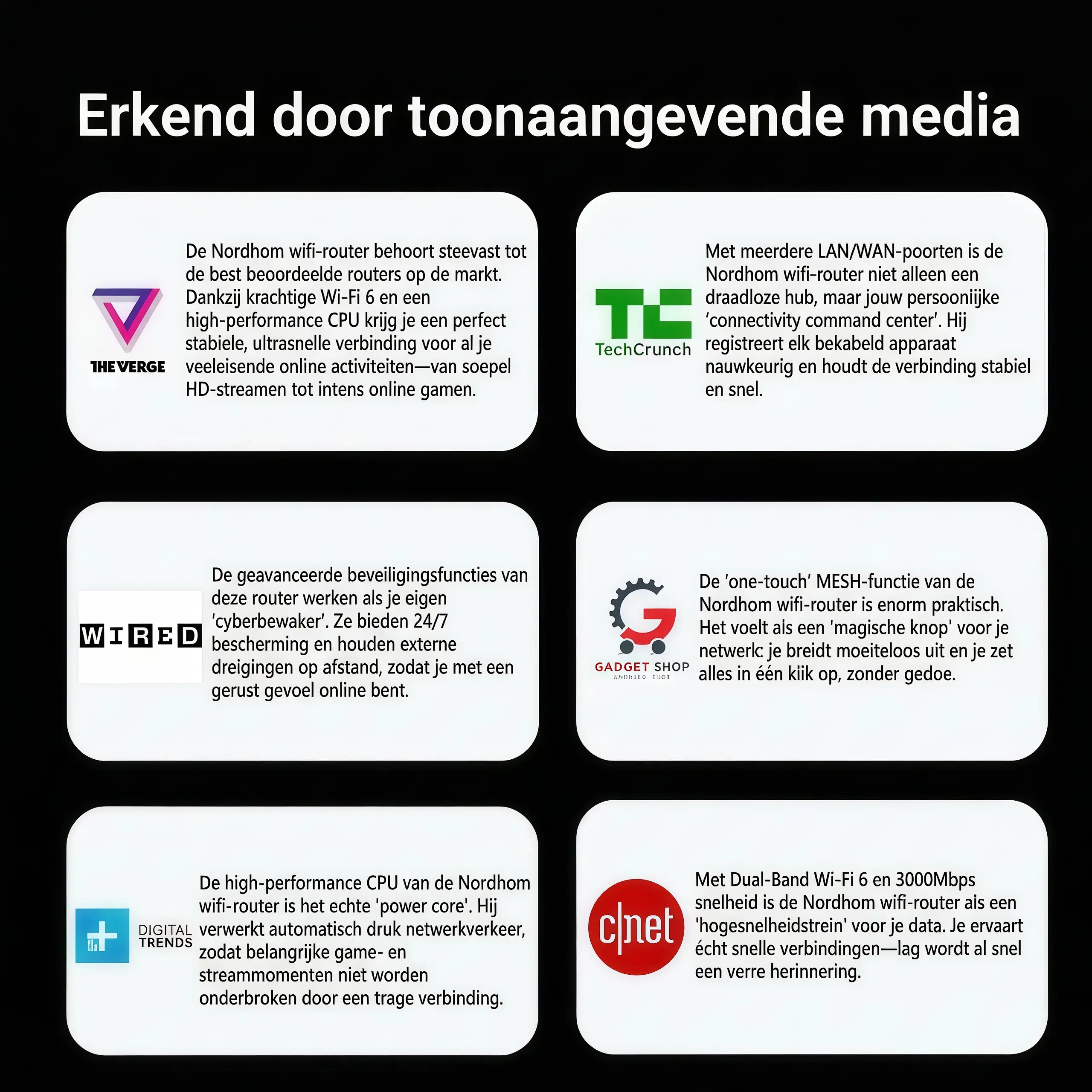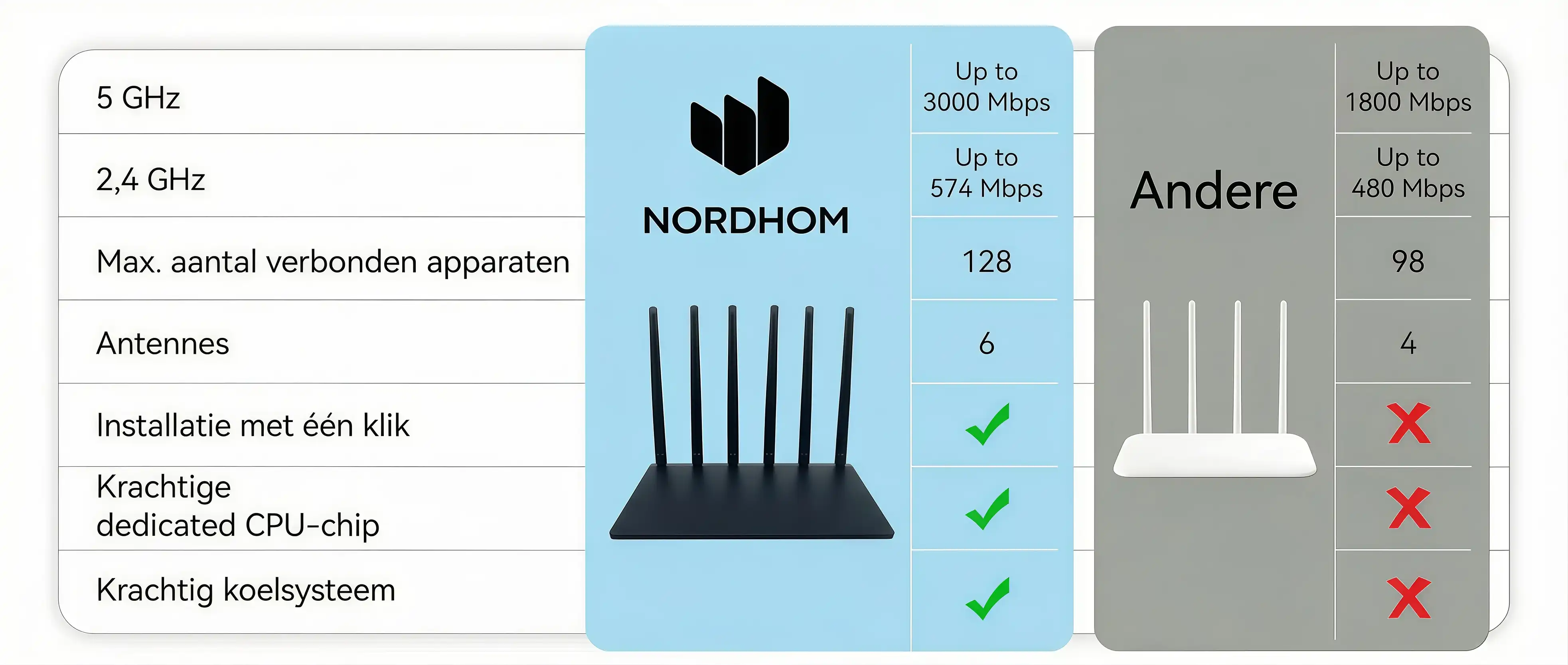 Nordhoms dual-band Wi‑Fi 6 zorgt voor een snelle en stabiele verbinding voor al je apparaten thuis. Dankzij het gebruik van zowel de 2,4- als 5 GHz-band geniet je van hoge snelheden voor veeleisende activiteiten – van HD-streaming tot gamen – met minder vertraging en minder netwerkdrukte.