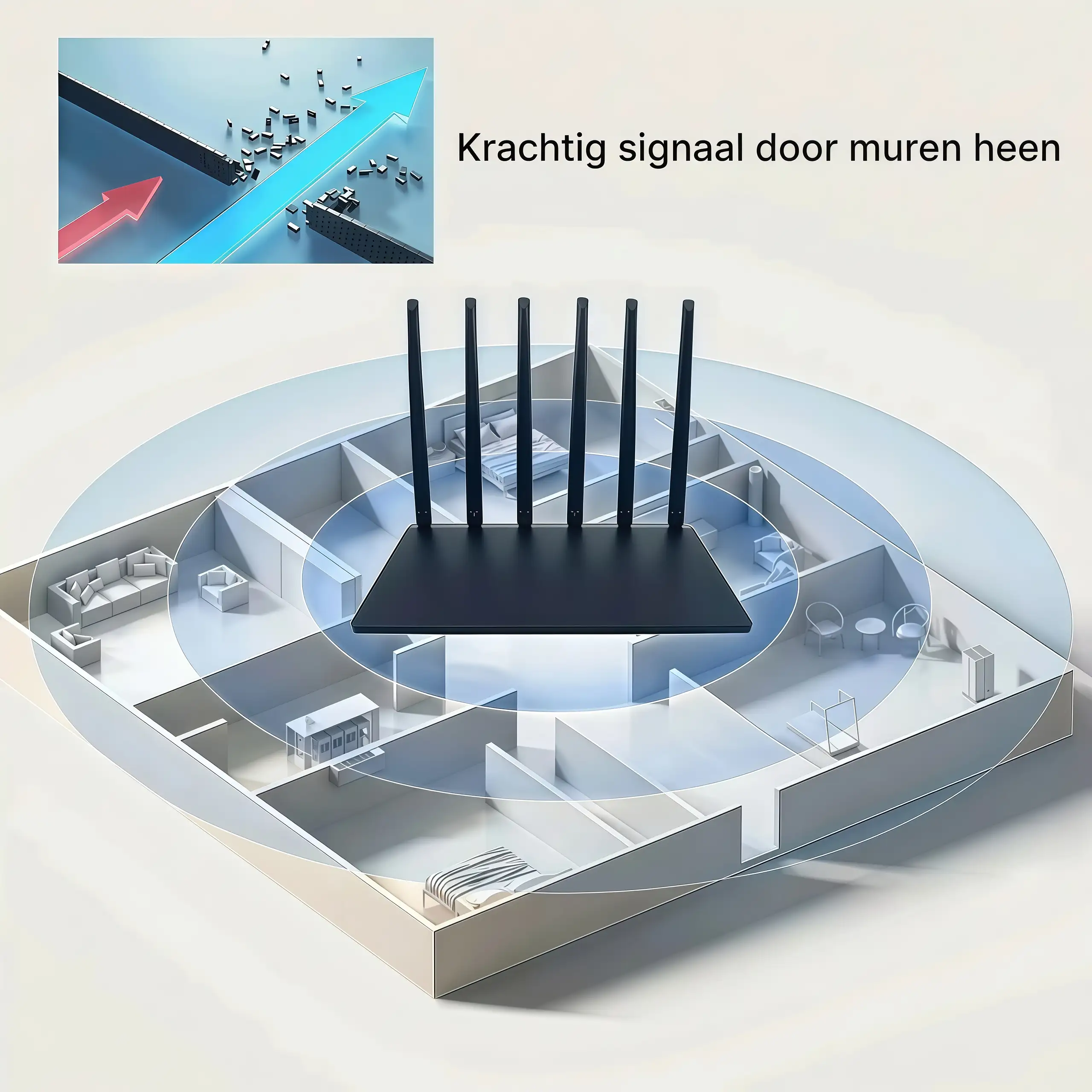 Dekking in het hele huis: 6 antennes met OFDMA en MU‑MIMO zorgen voor een stabiel signaal, tot 128 apparaten tegelijk.