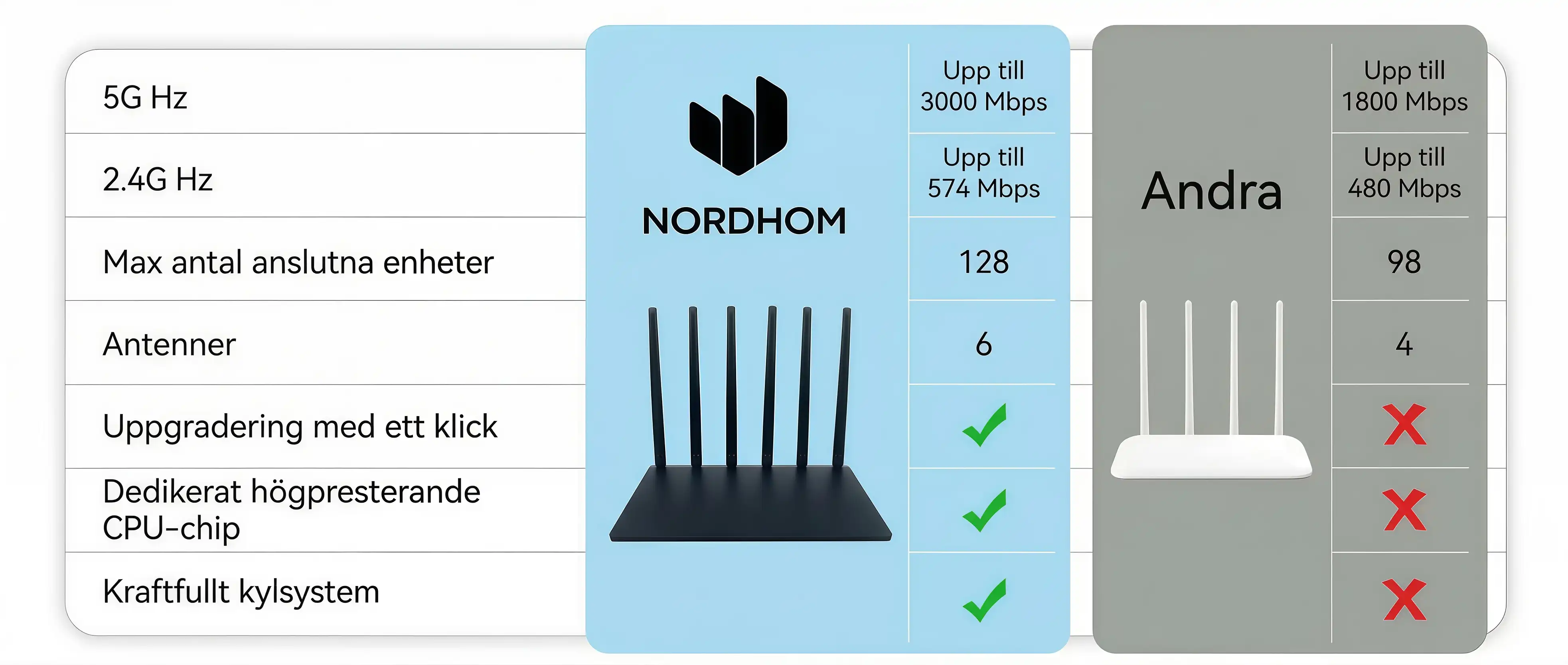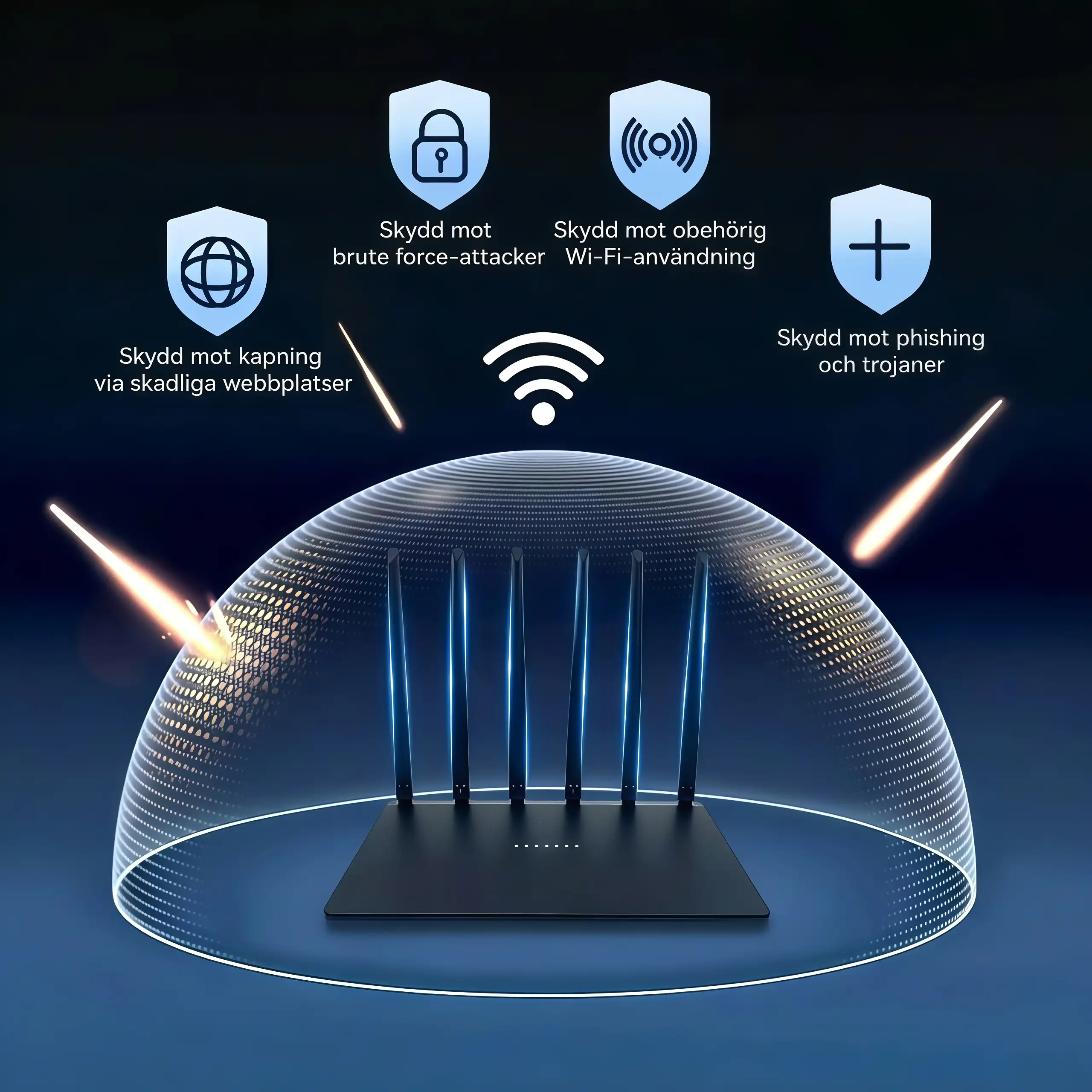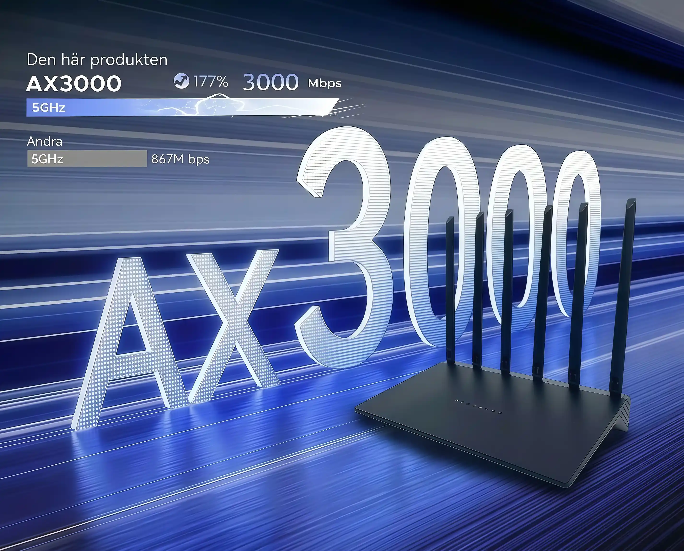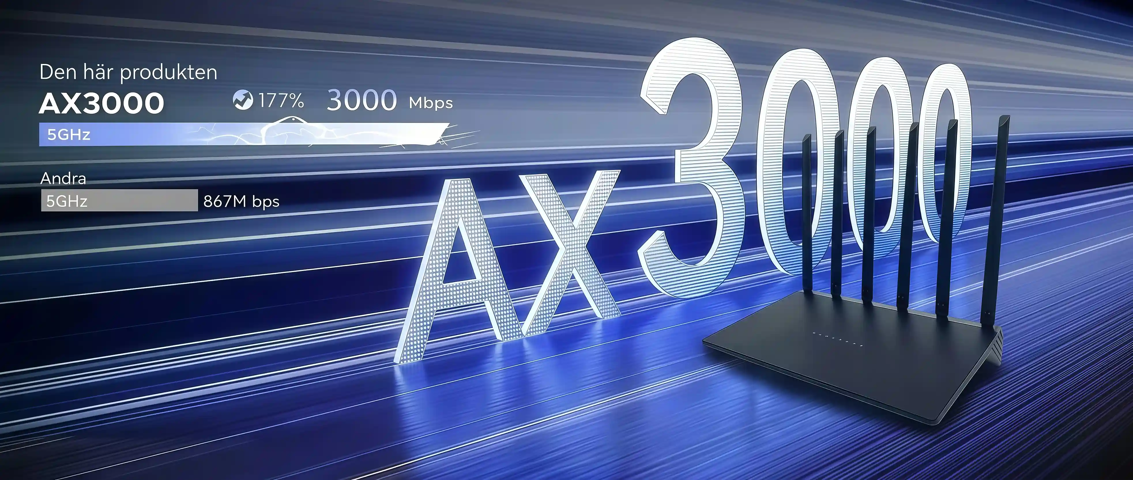 Dual-band Wi‑Fi 6: Njut av hastigheter upp till 3000 Mbit/s – 67 % snabbare än standardroutrar.